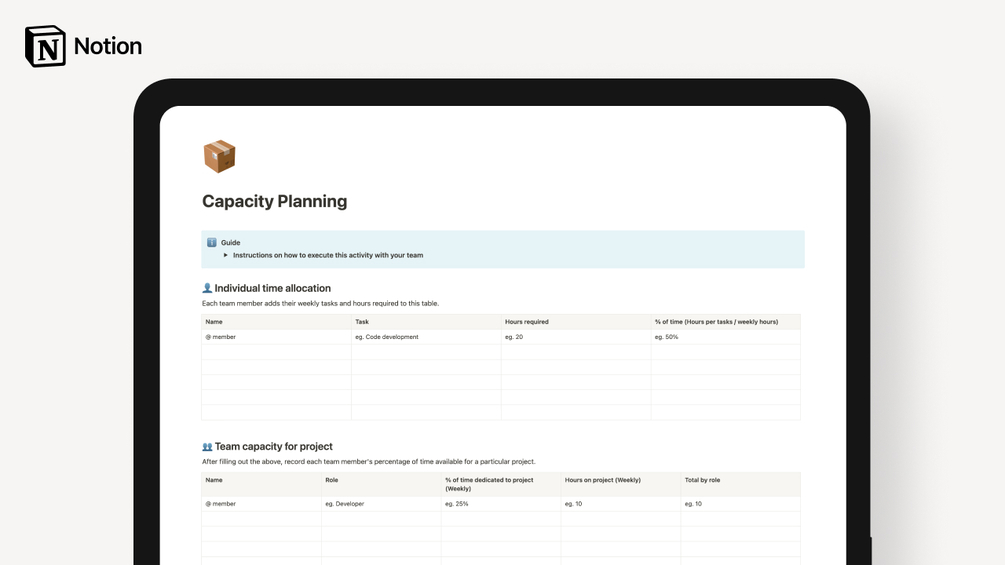 The Capacity Planning Notion template is designed to help teams gauge and strategise work distribution and future workload. It consists of a four-step guide that encourages team members to list their weekly tasks and the time spent on each. This aids in creating a snapshot of individual and team capacity.