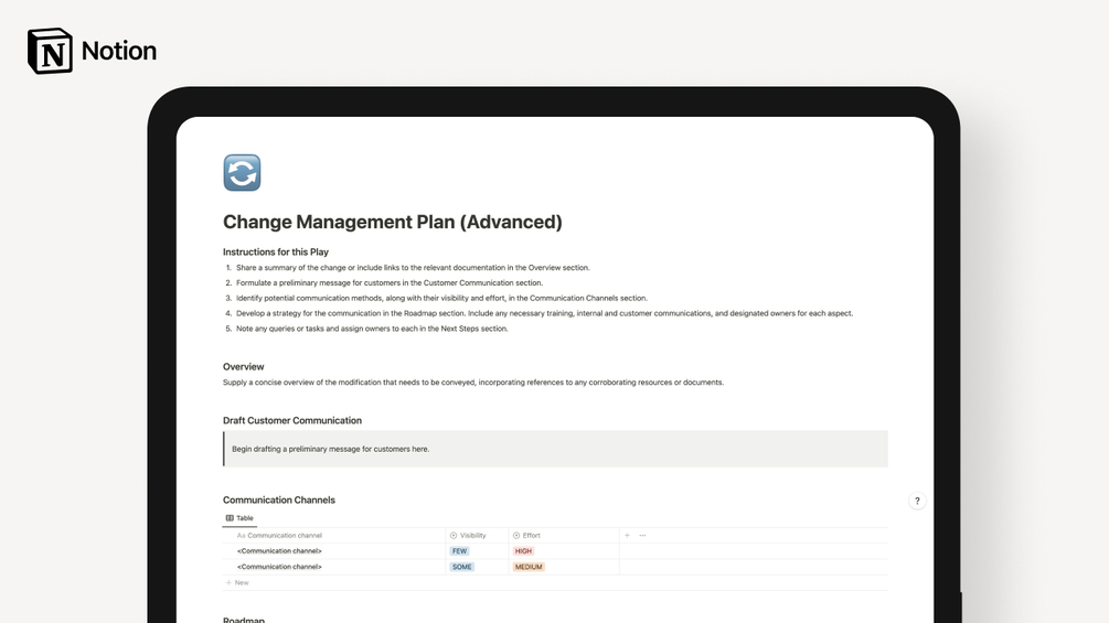 The Change Management Plan Notion template offers a structured way to manage changes within your organisation or project. It helps in ensuring that everyone involved—be it team members or customers—is on the same page about what changes are happening, why, and how they will be implemented.