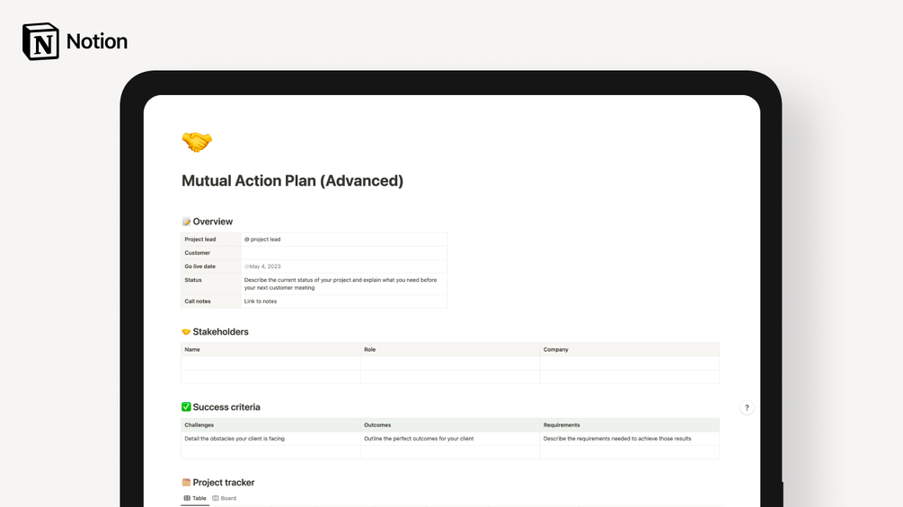 The Mutual Action Plan Notion template is designed to streamline the sales process, ensuring alignment between the sales team and stakeholders.