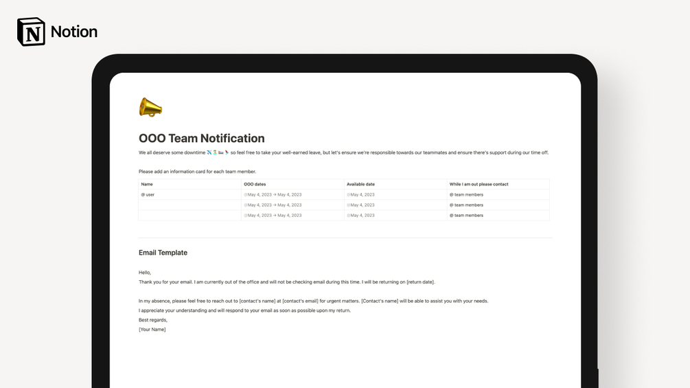 The OOO (Out of Office) Team Notification template is a straightforward way to keep your team informed about who's unavailable and when. It promotes responsible communication and ensures that work continues smoothly in a team member's absence.