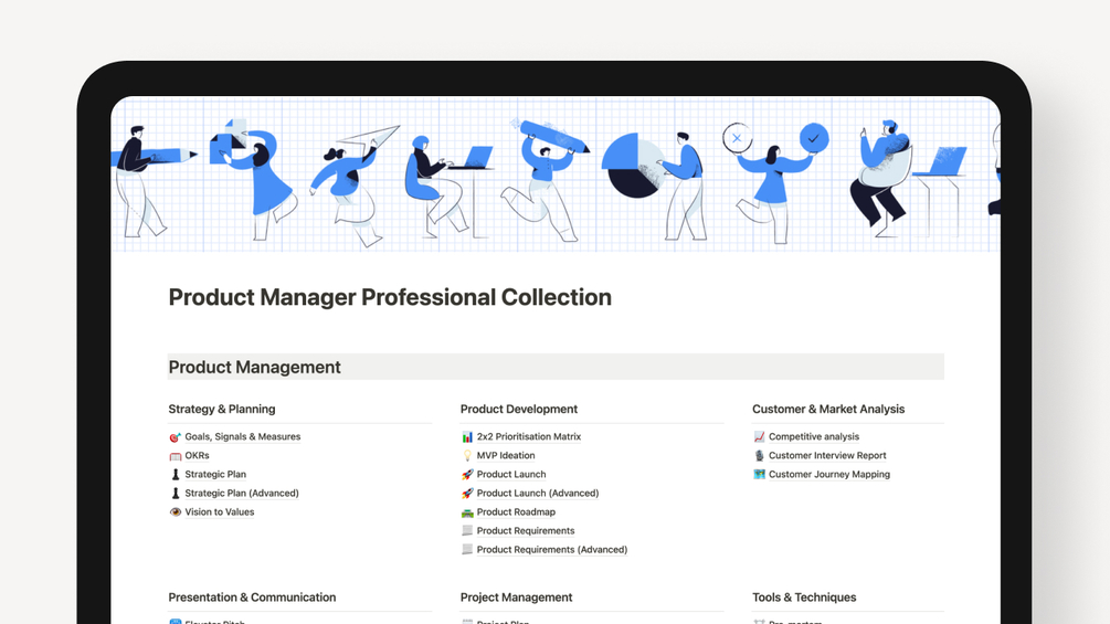 The Product Manager Professional Collection of Notion templates serves as your comprehensive toolkit for all facets of product management and project planning. Comprising 40 standard templates and 11 advanced options, each template is thoughtfully crafted to meet a wide range of professional requirements. From Lean Startup principles to User-Centric Design, this collection is your all-in-one resource for building and scaling successful products.