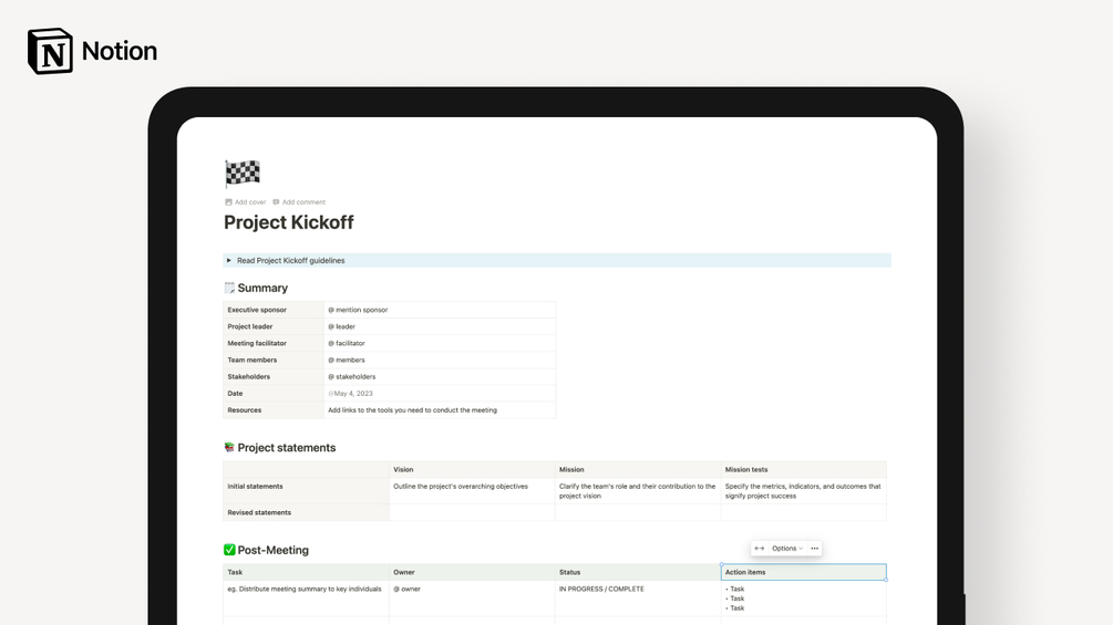 This Project Kickoff Notion template is designed to facilitate a smooth project kickoff meeting, ensuring that all team members are aligned on project expectations. It provides a step-by-step guide for preparation, setting the scene, and communicating the project's purpose.