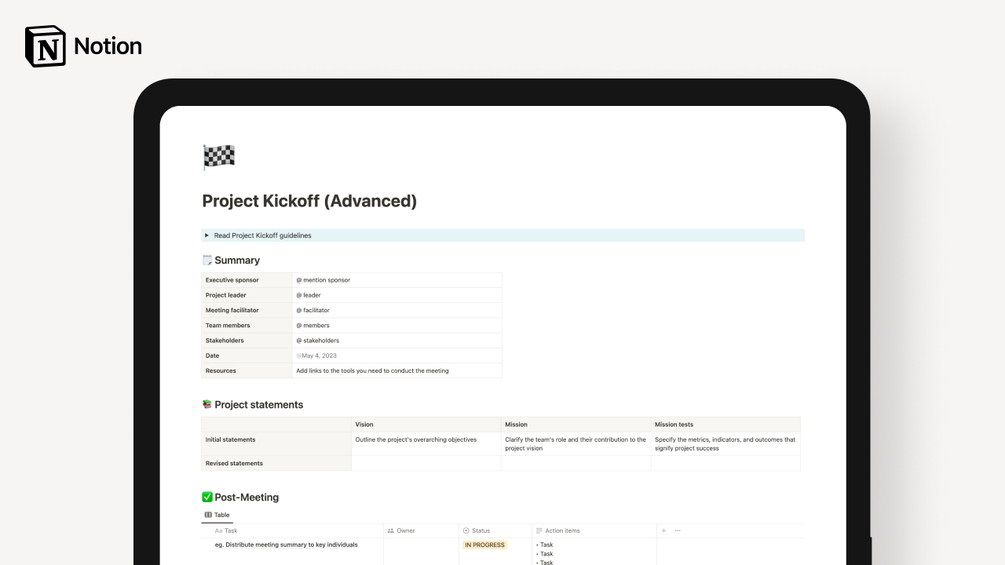 This Project Kickoff Notion template is designed to facilitate a smooth project kickoff meeting, ensuring that all team members are aligned on project expectations. It provides a step-by-step guide for preparation, setting the scene, and communicating the project's purpose.