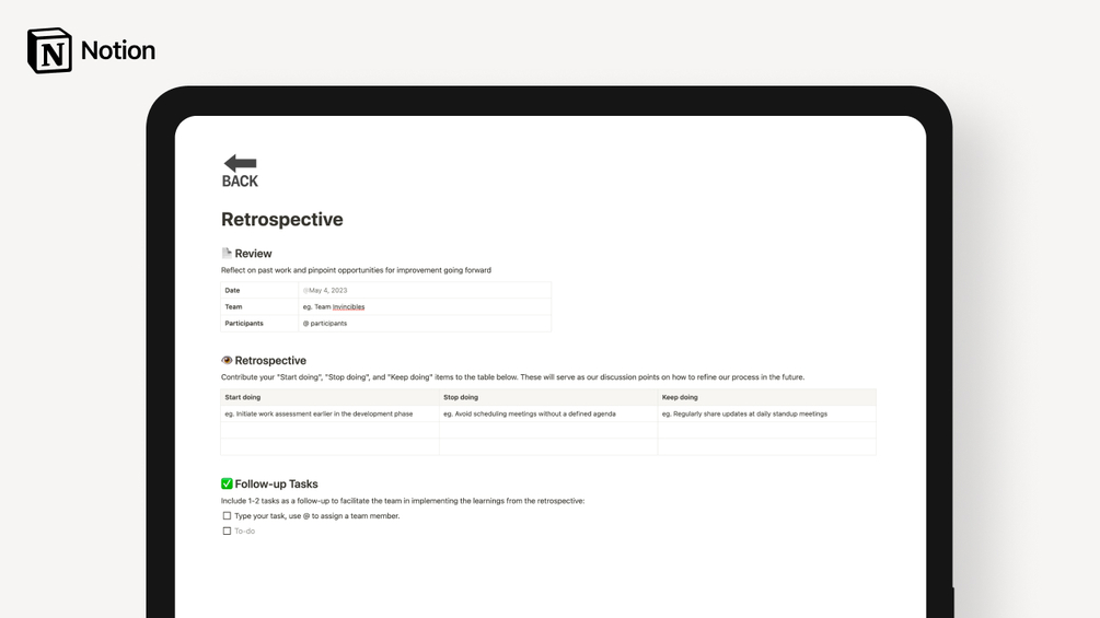 - Follow-up Tasks: Lists actionable tasks based on the retrospective's findings, ensuring that the team moves forward with the insights gained.