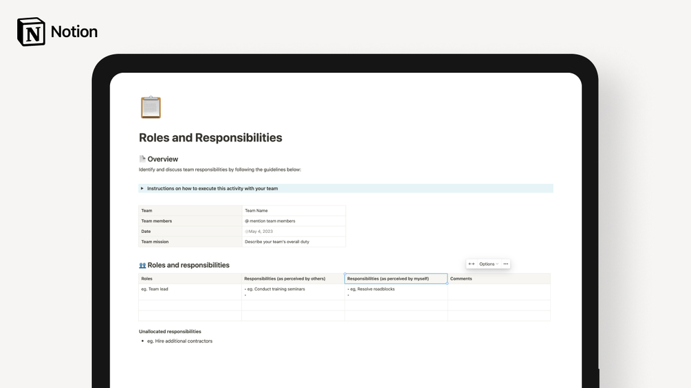 The Roles and Responsibilities Notion template is designed to clarify team duties for a more effective workflow. It's a structured guide that helps teams identify and discuss their roles and responsibilities through a series of steps.