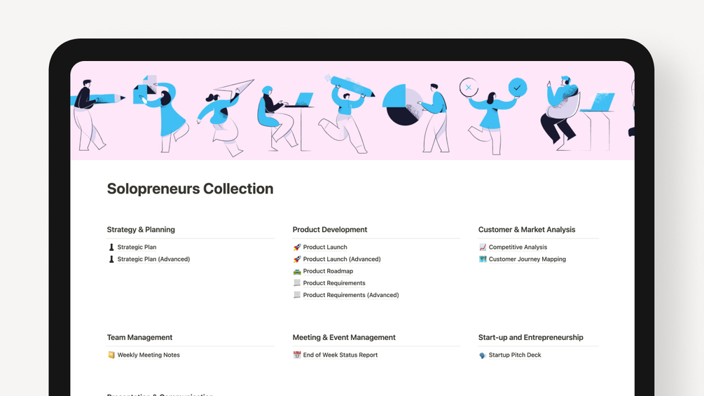 Unveiling the "Solopreneurs Collection" – a bespoke assortment of 15 Notion templates created specifically for the entrepreneurial individual. Juggling multiple roles? This collection is your single point of control for managing projects, setting achievable goals, and tracking your progress. Whether you're freelancing, consulting, or running a one-person empire, this set of Notion templates is designed to be the lifeline that keeps you organised, effective, and always a step ahead.