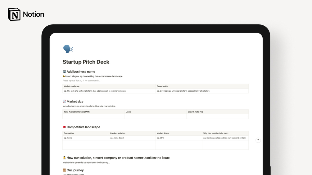 The Startup Pitch Deck Notion template is a comprehensive guide for startups looking to attract investors.