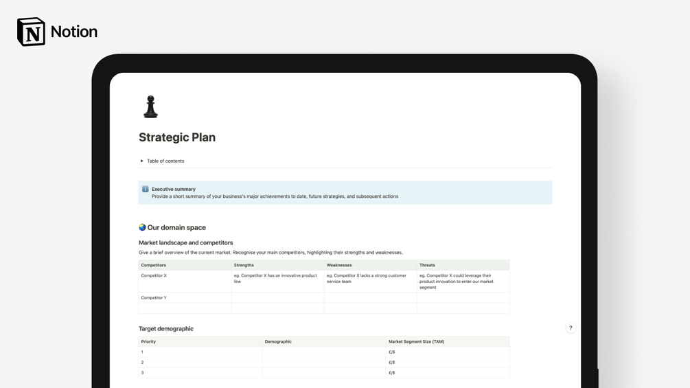 This Notion template serves as a comprehensive blueprint for articulating and showcasing your enterprise's strategy to executive teams. It includes sections for an executive summary, market analysis, target demographics, and a detailed action plan.
