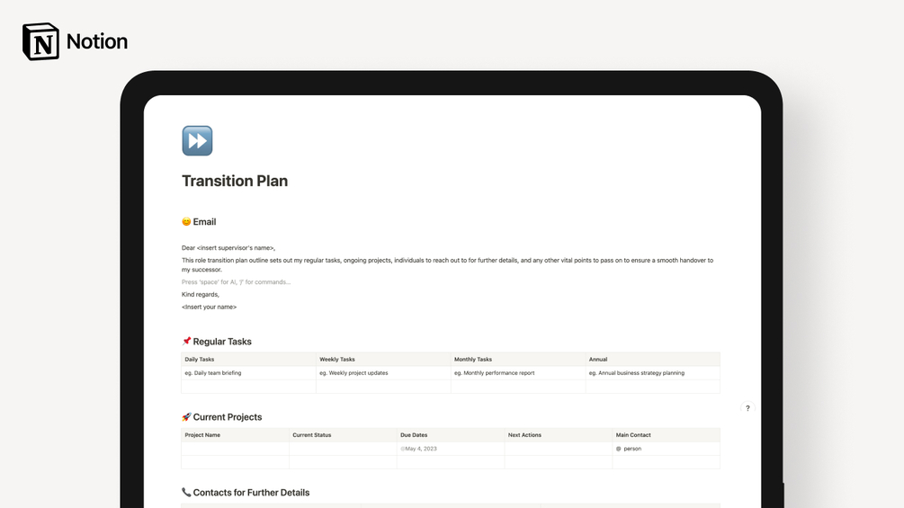 The Transition Plan Notion template is a comprehensive guide designed to facilitate a smooth role handover to a successor.