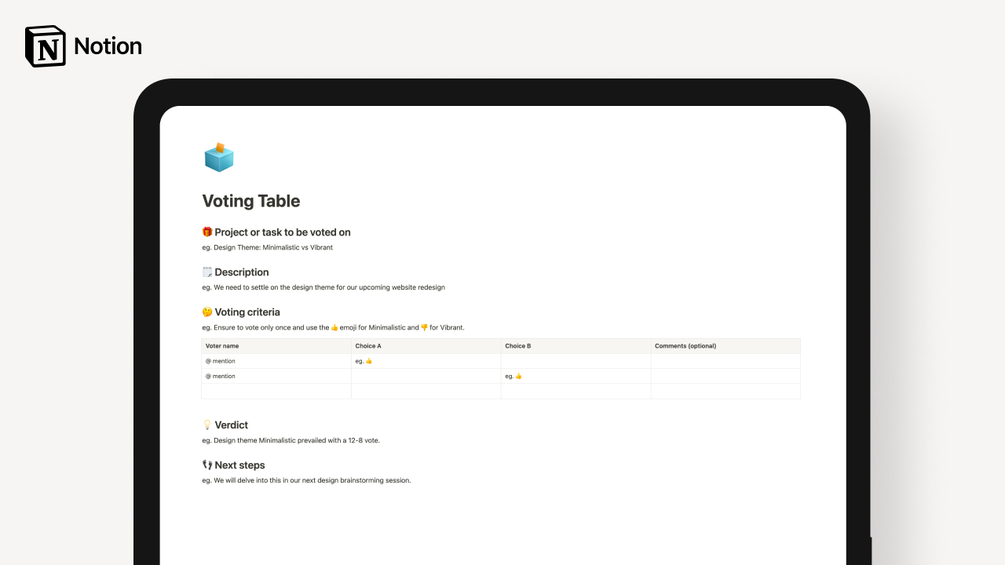 The Voting Table Notion template is a straightforward tool for facilitating team decisions, often used for choosing between options like design themes. It outlines the project or task at hand, provides a brief description, and sets the voting criteria, usually through emoji representation.