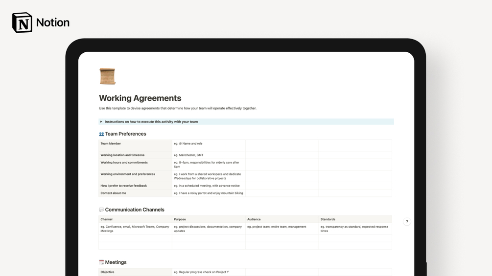 The Working Agreements Notion template is a comprehensive guide for establishing team norms and expectations. It covers everything from team and leader preparation to communication channels, meeting protocols, and escalation processes.